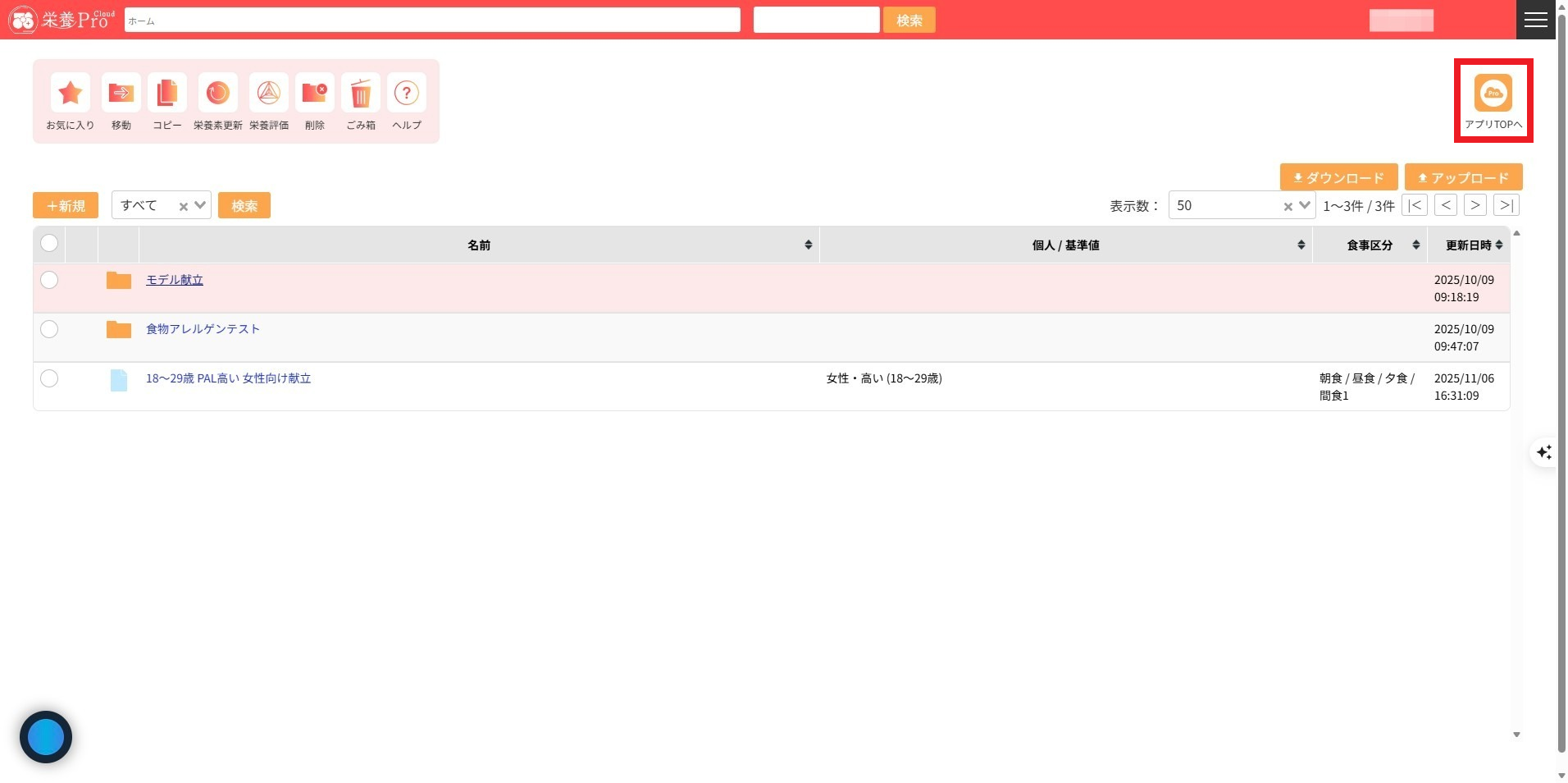 4.栄養Proクラウドのポータル画面に戻るには、右上の「アプリTOPへ」をクリックしてください。