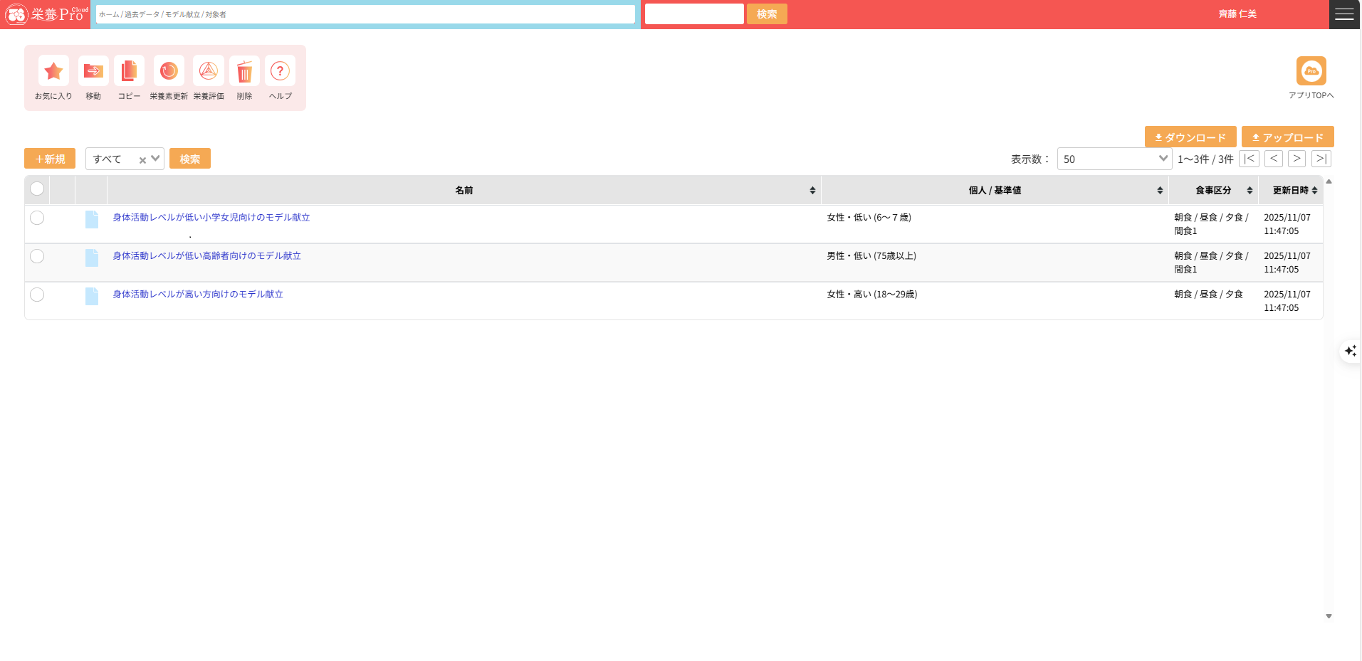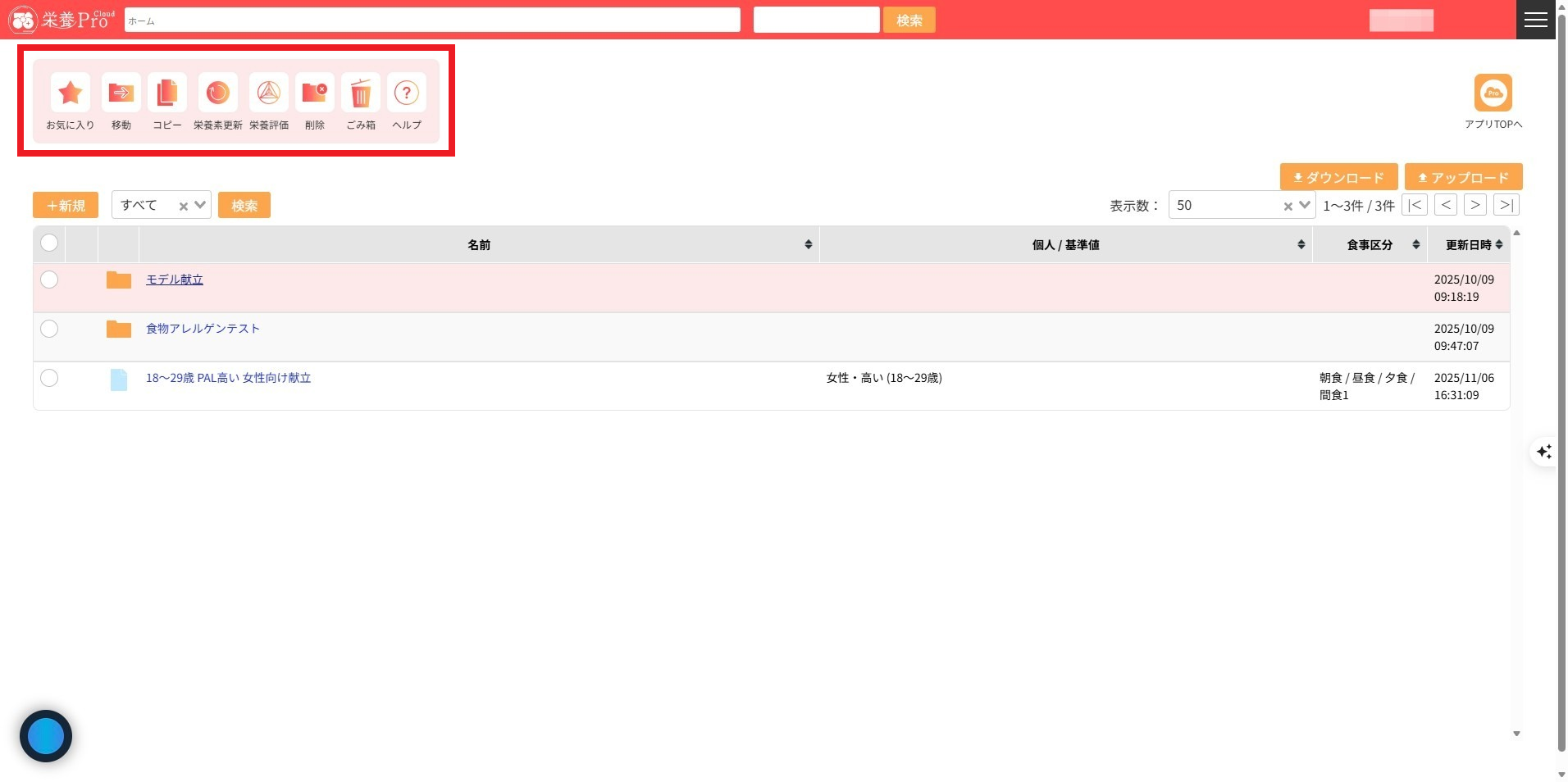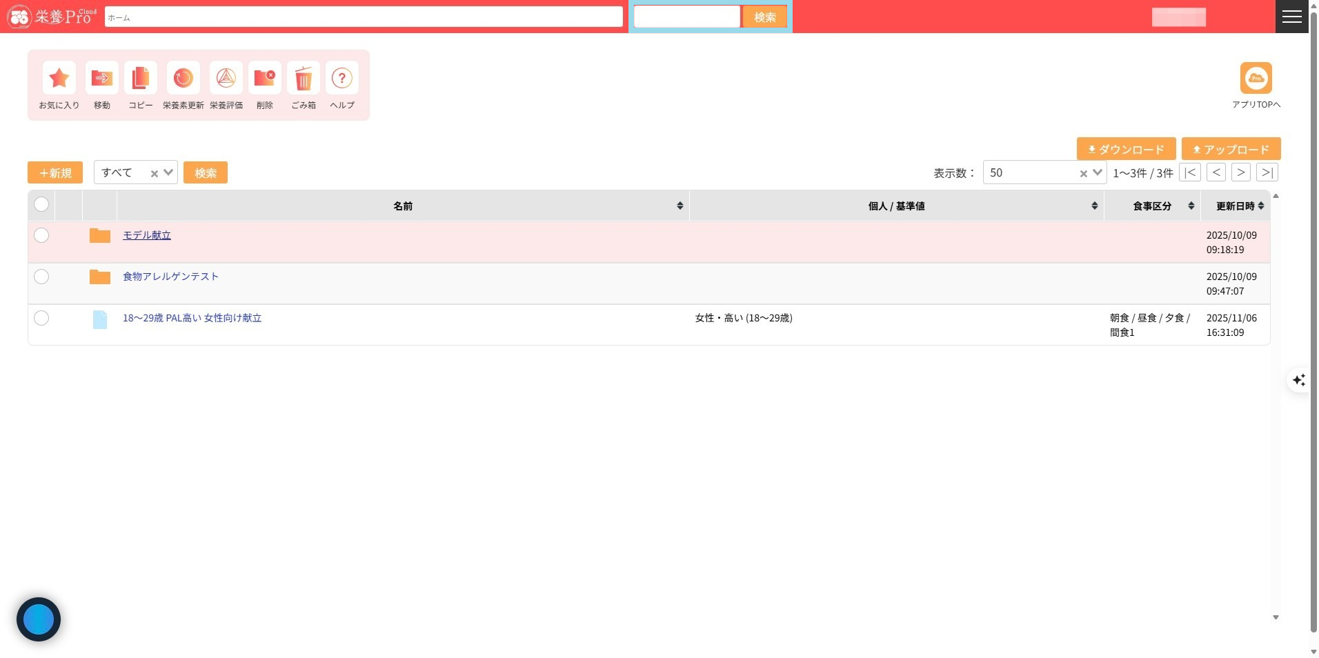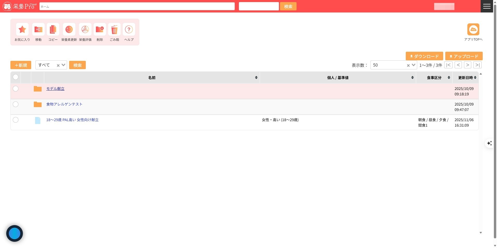 栄養Proクラウドのクラウドストレージにフォルダ・献立ファイルを作成し管理できます。こちらは、栄養Proクラウドのホーム画面です。