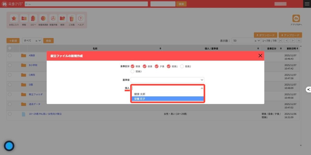 4.個人は「個人管理」で登録されている個人を割り当てできます。個人を割り当てた場合、基準値は自動的に解除されます。 個人に割り当てられている基準値が栄養評価に反映されます。
