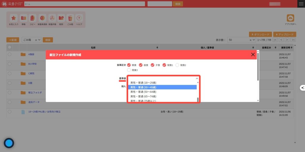 3.基準値は「基準値管理」で登録されている基準値を割り当てできます。 標準では「日本人の食事摂取基準(2025年版)」が登録されていて割り当てることができます。基準値を割り当てた場合、個人は自動的に解除されます。 *女性の場合は「月経なし」を基準としています。「妊婦」や「月経あり」の場合は、個人管理で登録を行い、その値を割り当ててください。基準値を割り当てた場合、個人は自動的に解除されます。