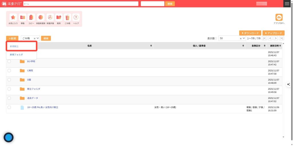 1.栄養Proクラウドのホーム画面にある「新規」をクリックして「新規献立」をクリックします。