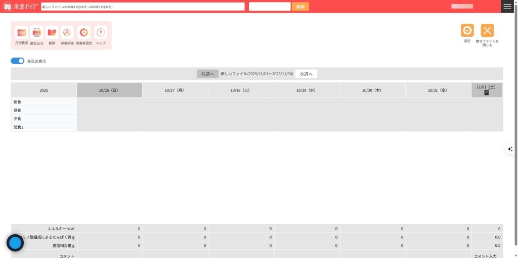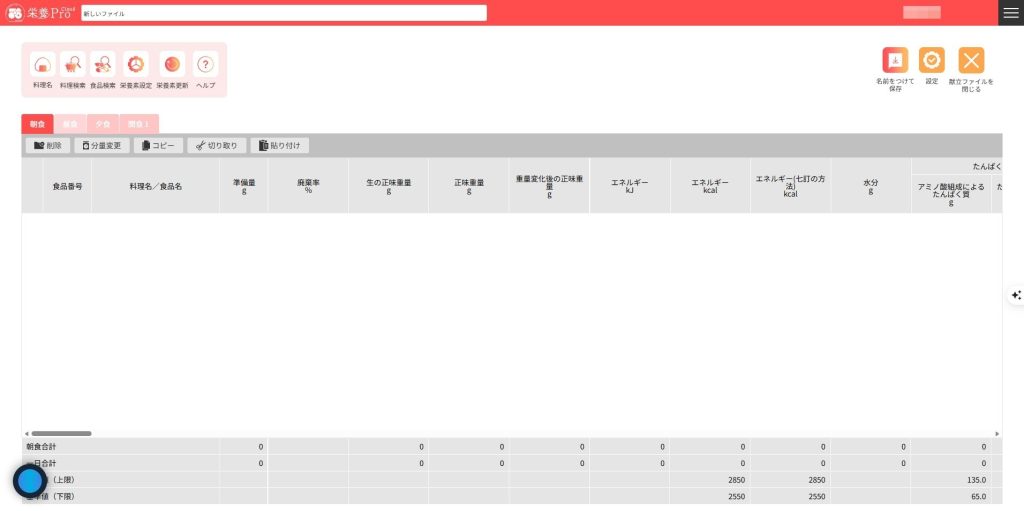 6.新しい献立ファイルが作成され、献立編集画面が表示されます。※基準値や個人は、最初の段階で割り当てをしなくても献立登録できますが、栄養評価をすることはできません。栄養評価を行う場合は、必ず基準値または個人を割り当ててください。