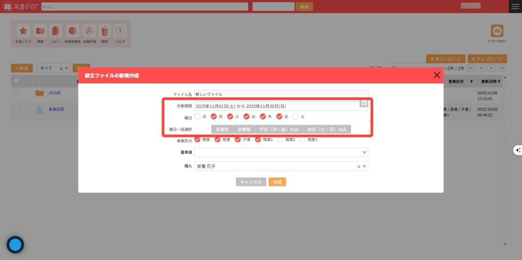 5.複数日献立ファイルを作成する場合は、「対象期間」「曜日/曜日一括選択」を設定します。