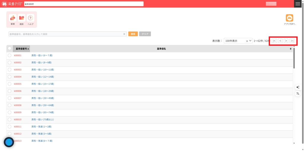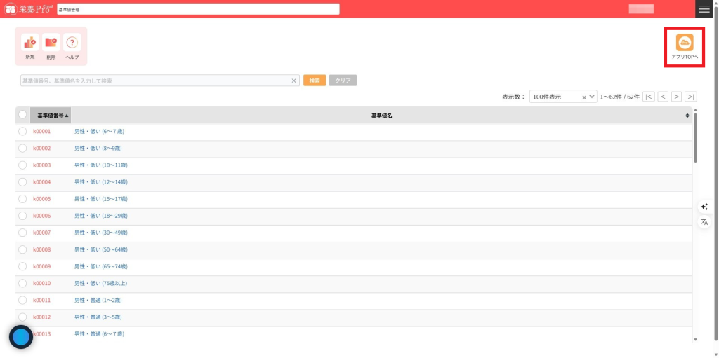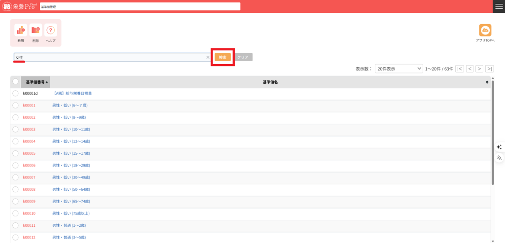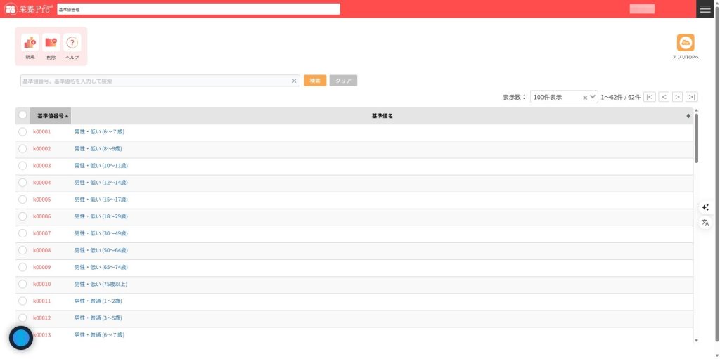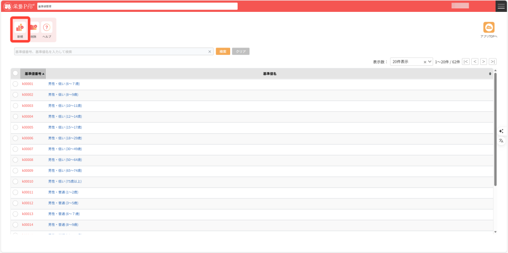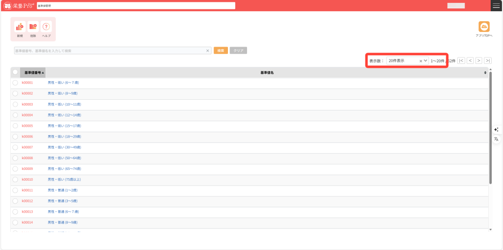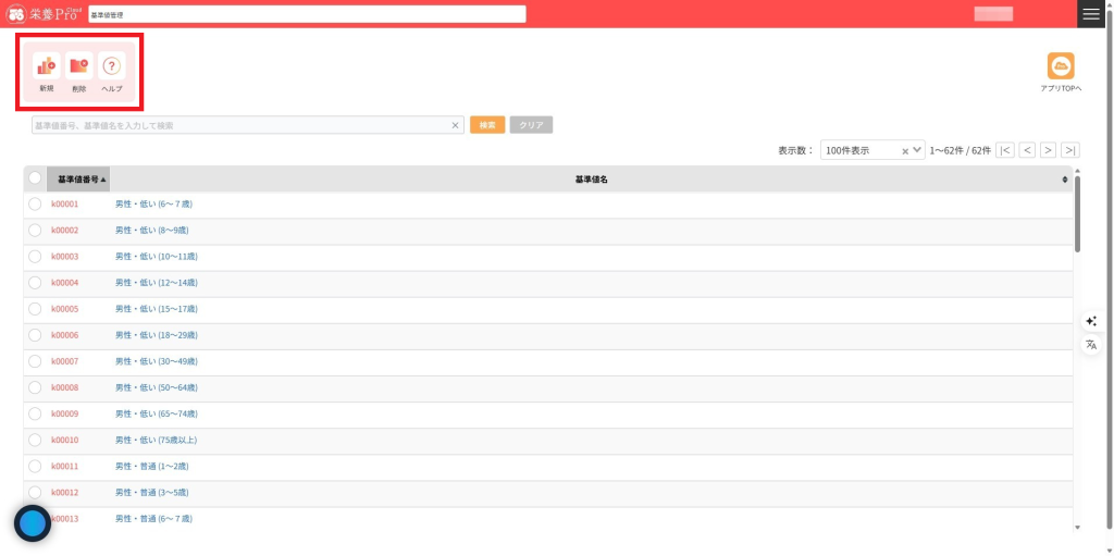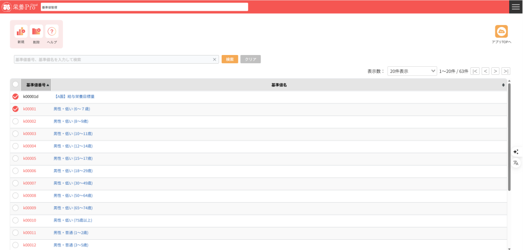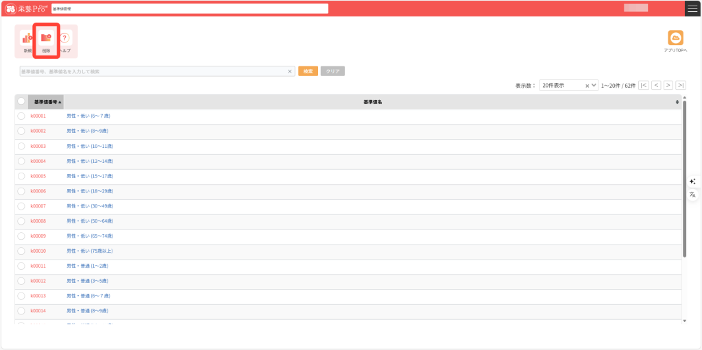 6.赤色の基準値番号は標準収載の基準値のため、削除することはできません。下図の場合、「k00001d 【A園】給与栄養目標量」は削除できますが、「k00001 基準値・男性・低い (6~7歳)」は標準収載の基準値のため、削除できません。