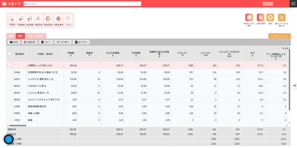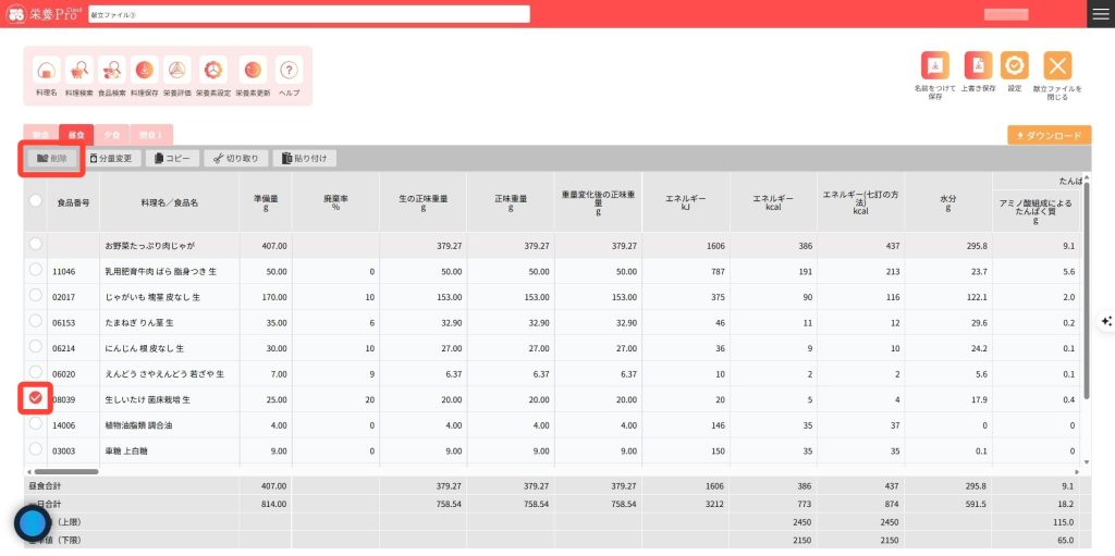 1.削除したい料理名または食品の左横の〇をチェックし、ツールバーの「削除」をクリックします。