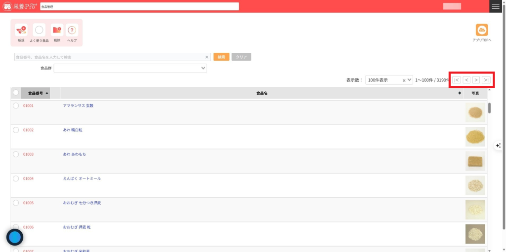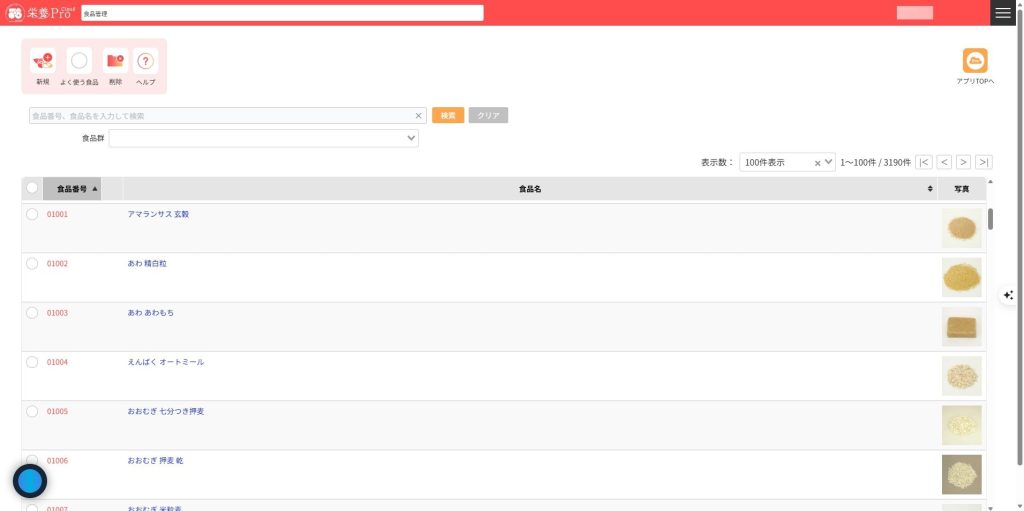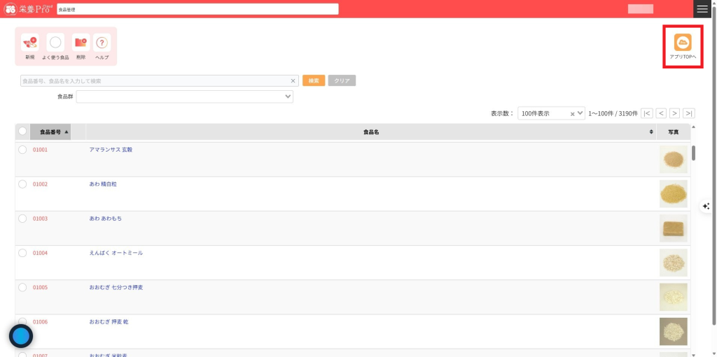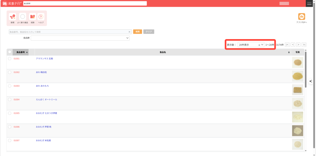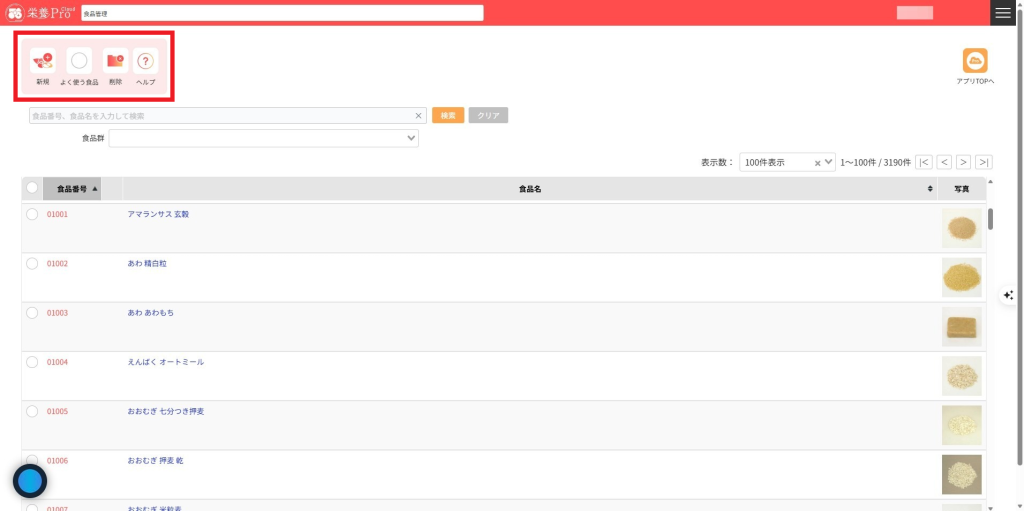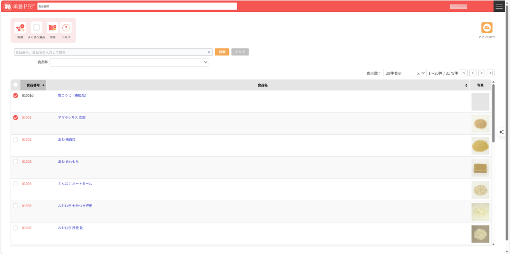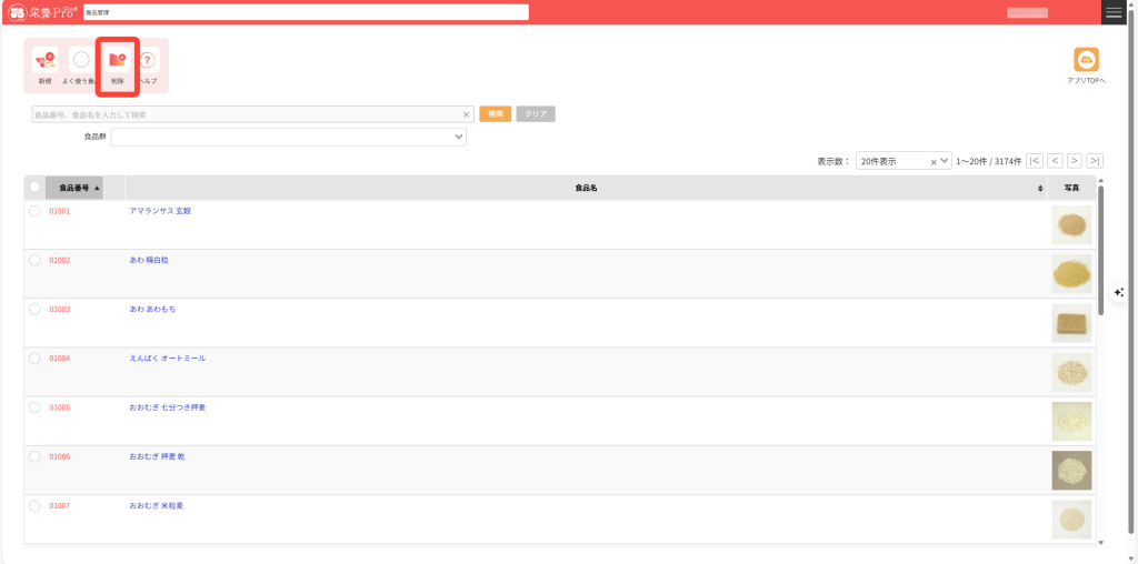 6.赤色の食品番号は標準収載食品の為、削除することはできません。下図の場合、「18001d コンビニおにぎり(鰹)」は削除できますが、「01001 アマランサス 玄穀」は標準収載食品の為、削除できません。