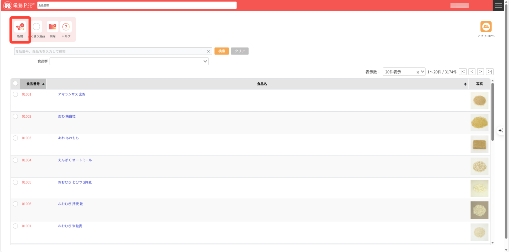 4.「新規」をクリックすると食品登録するための食品編集画面が開きます。