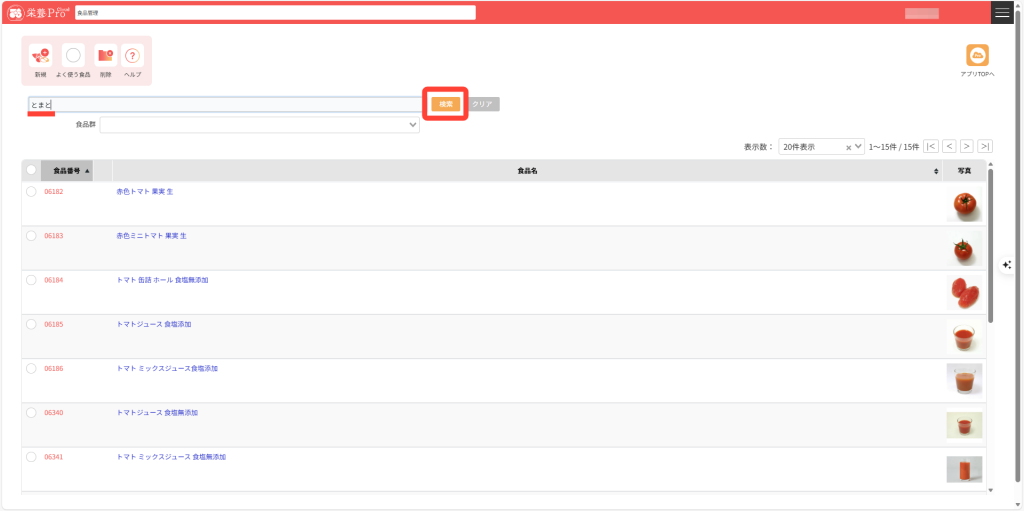 7.検索ボックスに食品のキーワードを入力してキーボードの「Enter(Macの場合はReturn)」を押します。検索の実行はキーワード左横の「検索」ボタンをクリックして行うこともできます。