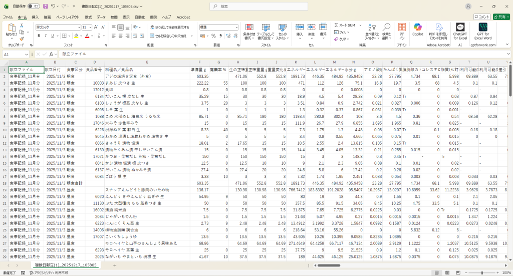 - 1つのファイルでダウンロード:複数の献立ファイ ルで1つのCSV1シートにまとめます。