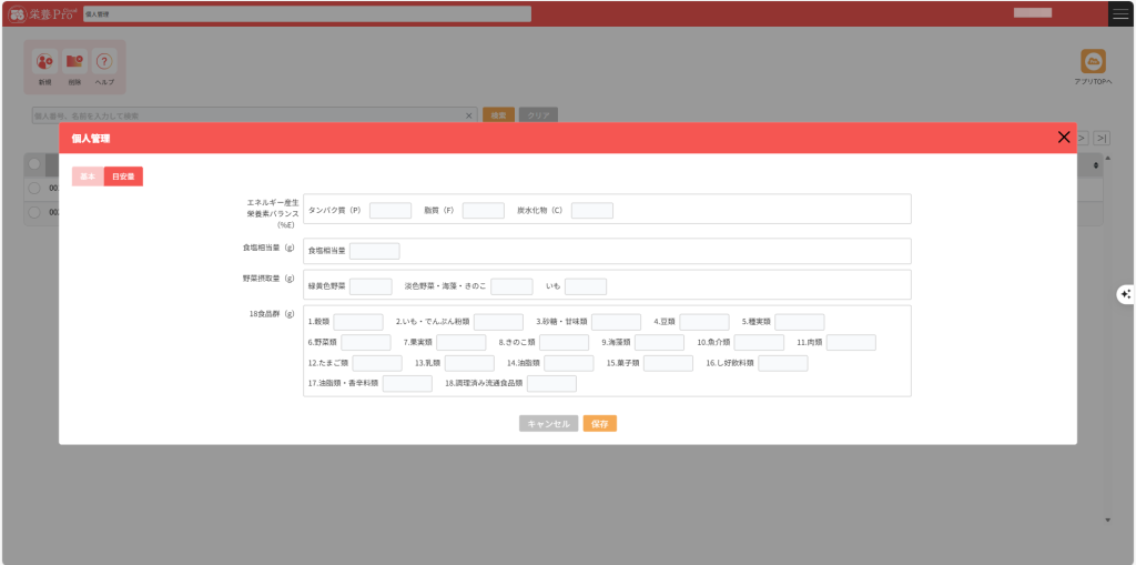 4.「目安量」タブでは、栄養評価に用いる評価基準を設定することができます。ここで設定された値を基に、栄養評価がなされます。