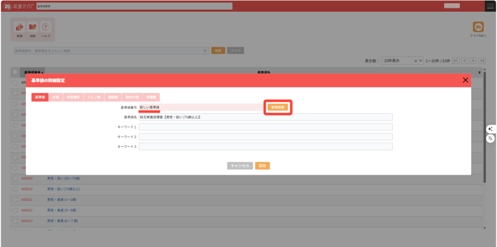 「新規採番」ボタンをクリックすると、新しい基準値として登録することもできます。