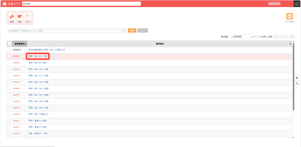 1.基準値管理画面にて、編集したい基準値を検索して基準値名をクリックします。