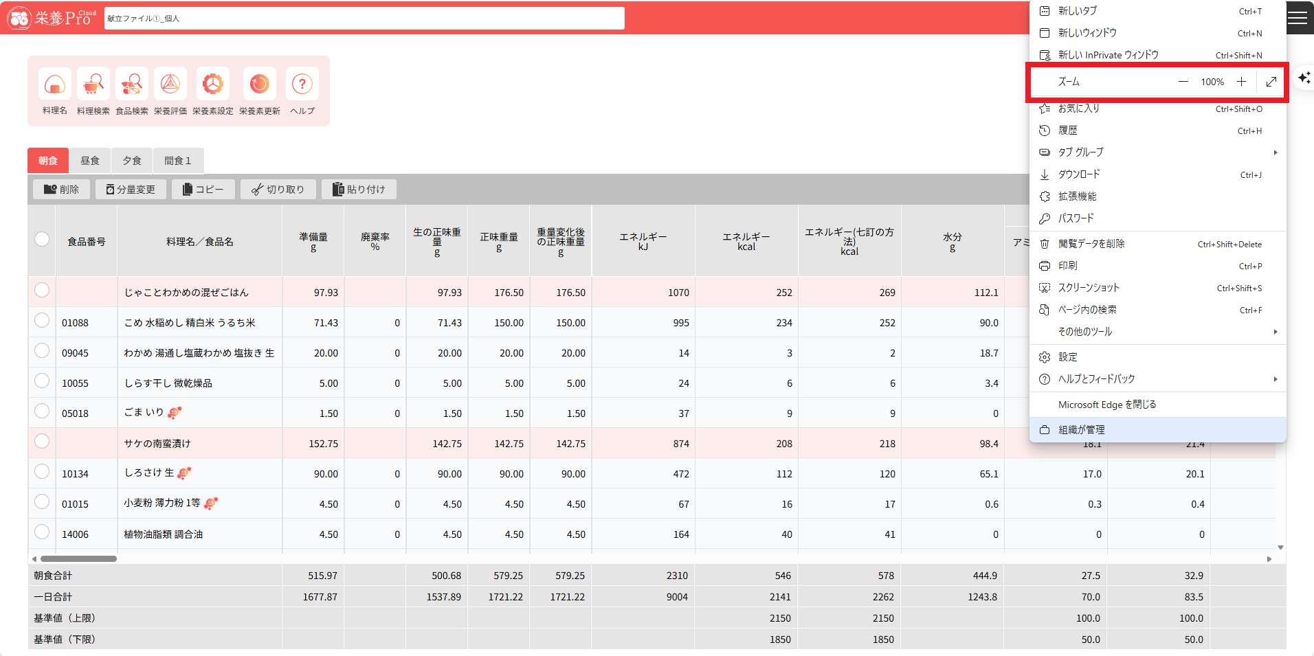 →栄養Proクラウドの献立作成画面を開いていただき、[Ctrl]+マウスホイールを手前に動かしてください。